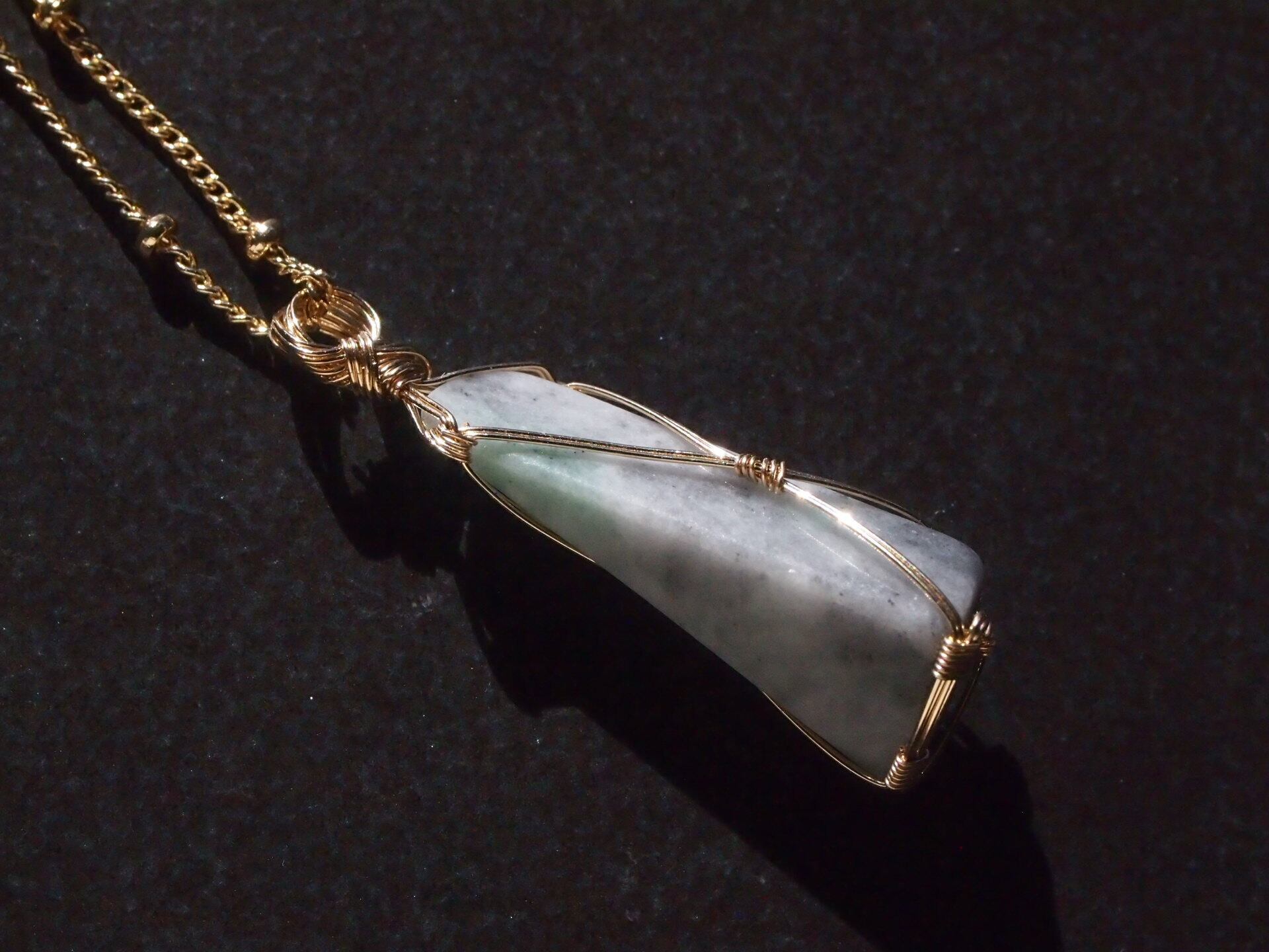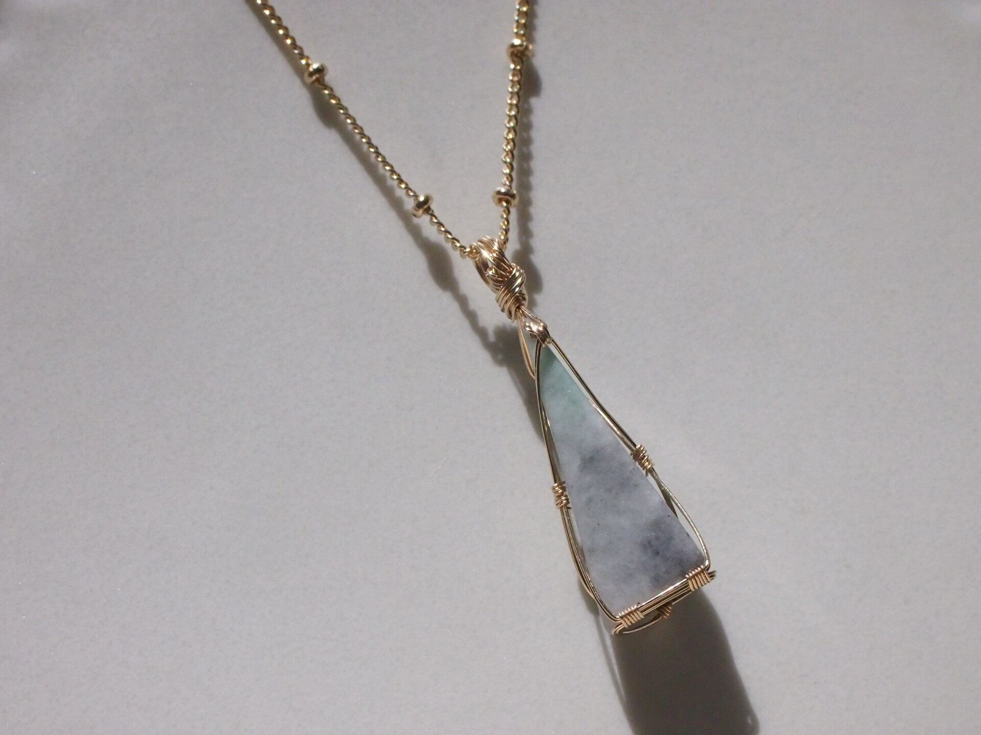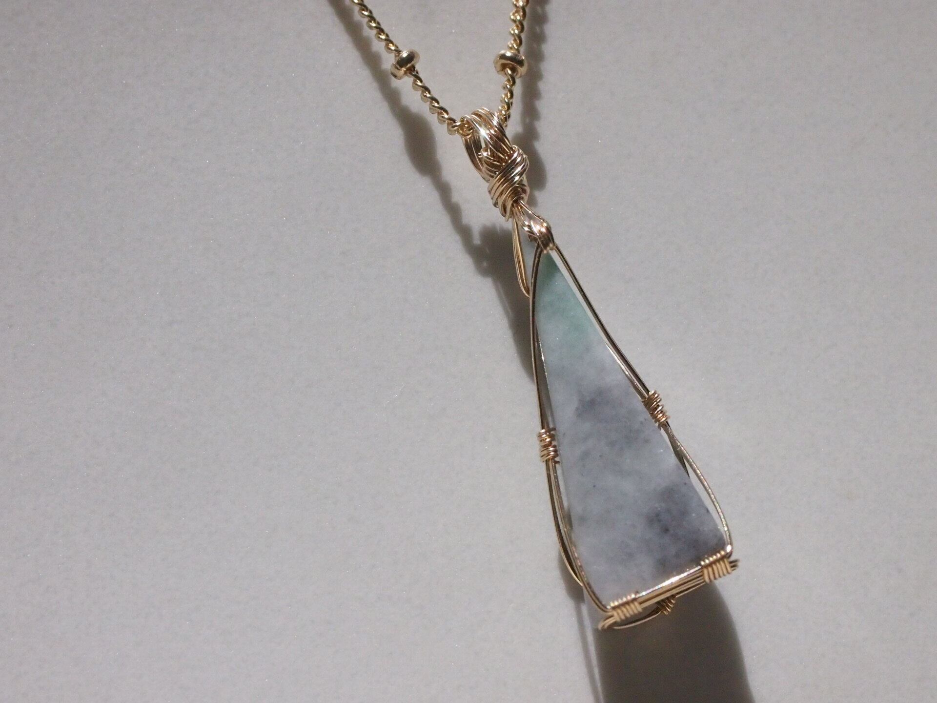 優しいアップルグリーンの入る糸魚川産の翡翠を14kgfワイヤーで繊細に女神巻き®ペンダントトップに仕上げました♡