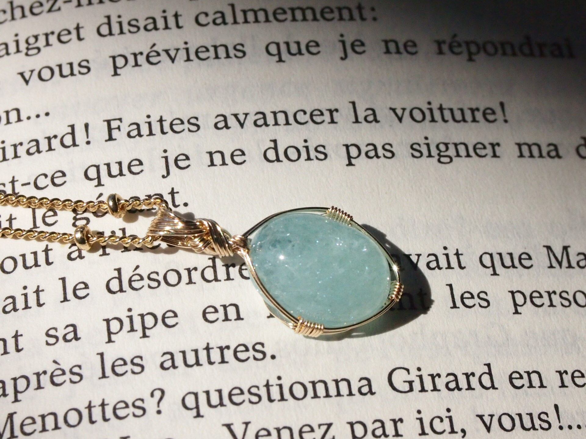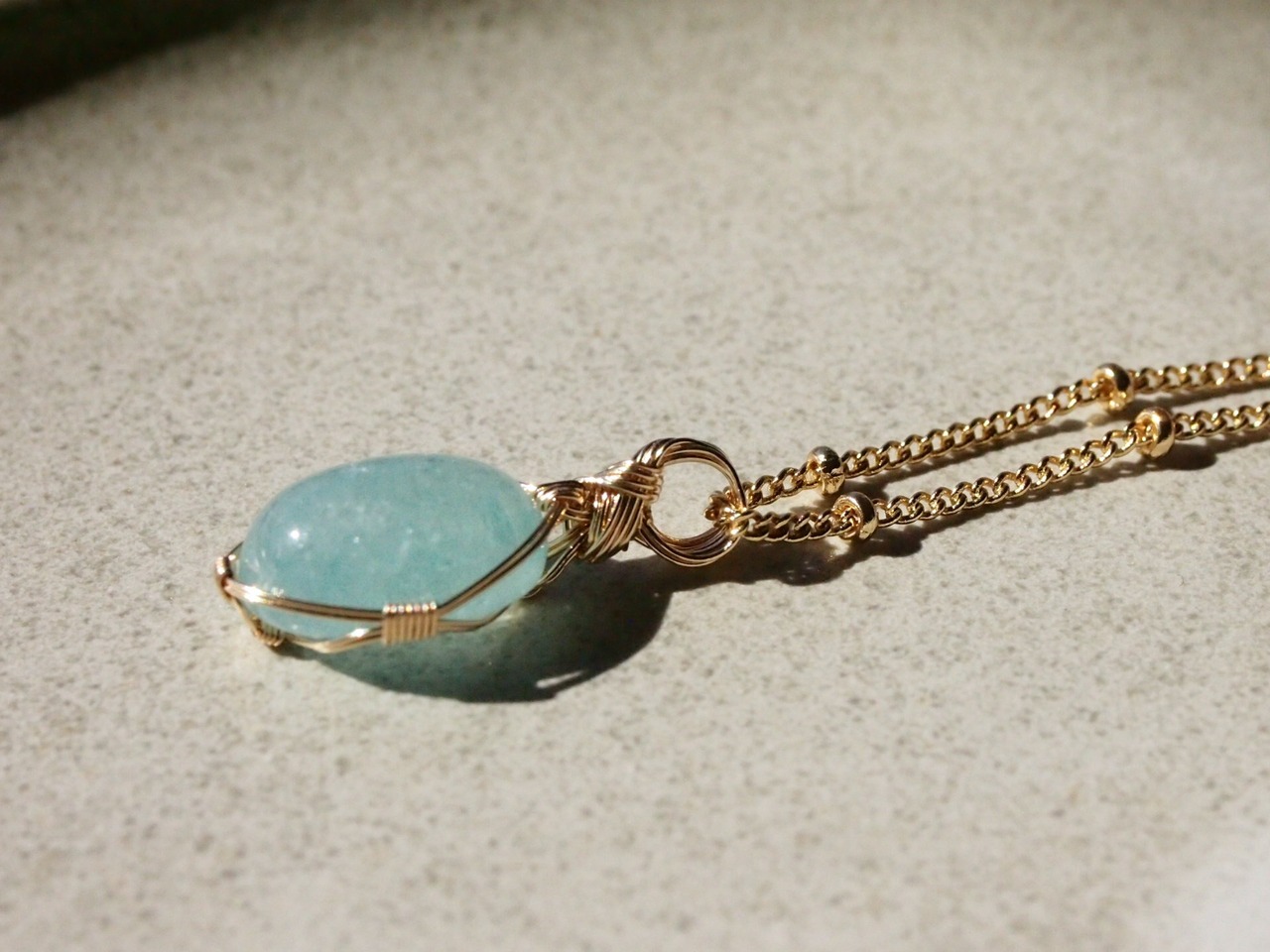 3月の誕生石のアクアマリンを14kgfワイヤーで繊細に女神巻き®ペンダントトップに仕上げました♡